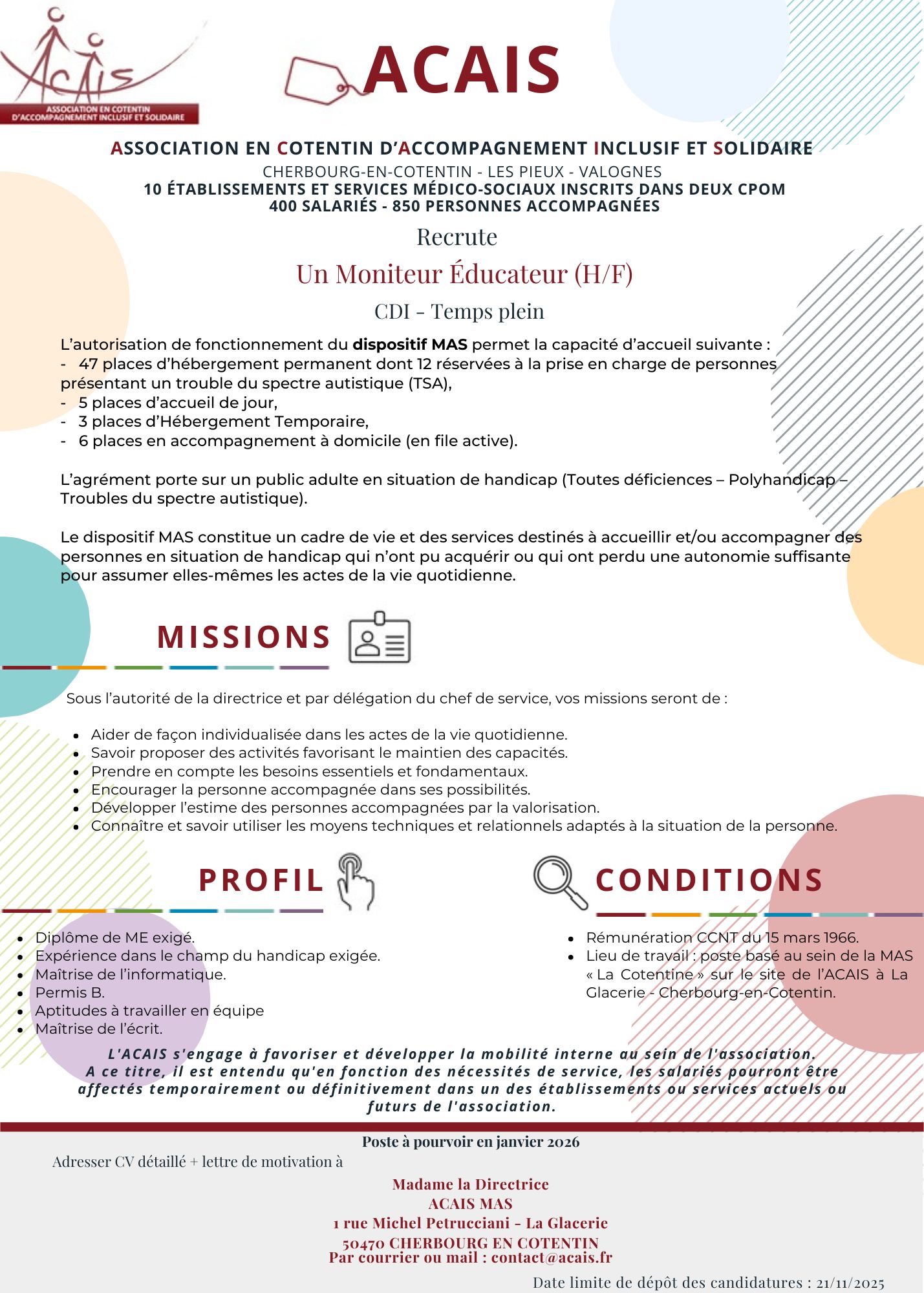 L’ACAIS recrute un Moniteur éducateur (H/F) au sein du dispositif MAS.