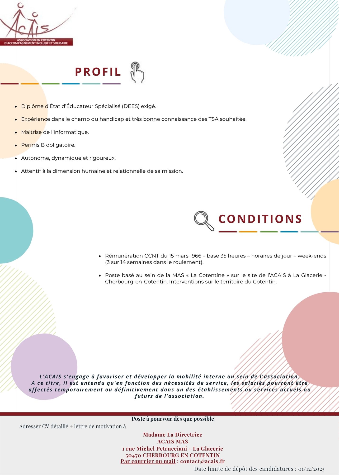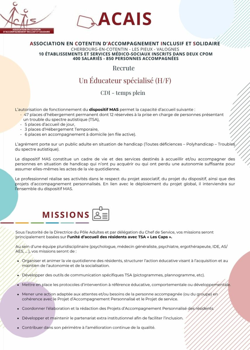 L’ACAIS recrute un Éducateur Spécialisé (H/F) au sein de l’unité d’accueil des résidents avec TSA « Les Caps ».