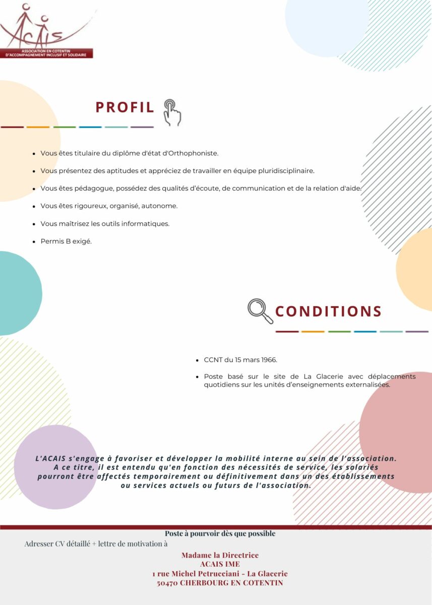 L’ACAIS s’engage à favoriser et développer la mobilité interne au sein de l’association. A ce titre, il est entendu qu’en fonction des nécessités de service, les salariés pourront être affectés temporairement ou définitivement dans un des établissements ou services actuels ou futurs de l’association