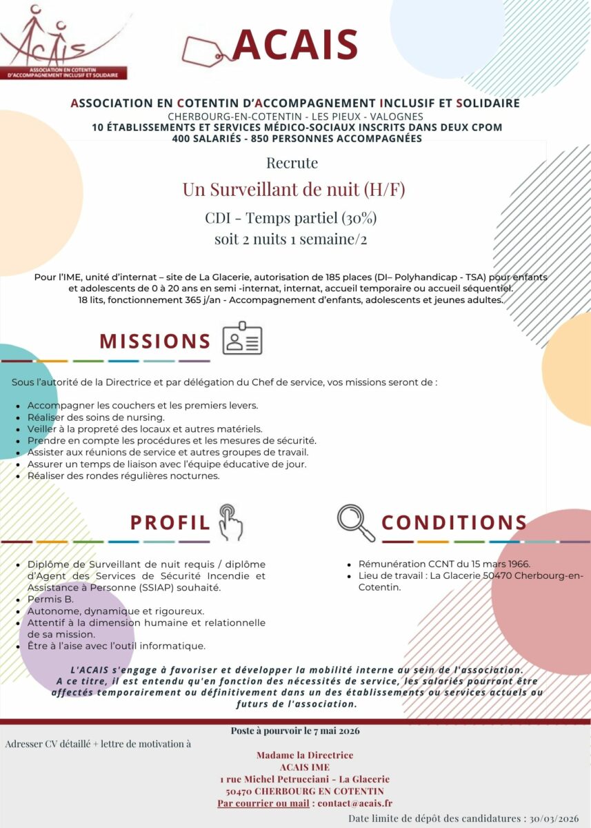 En tant que Surveillant de nuit, vous êtes autonome, vous avez le sens du contact, vous êtes attentif aux besoins des personnes en situation de handicap.