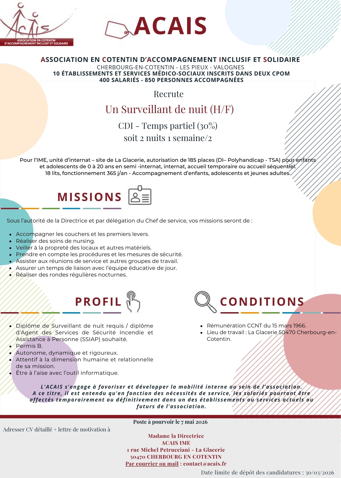 L’ACAIS s’engage à favoriser et développer la mobilité interne au sein de l’association. A ce titre, il est entendu qu’en fonction des nécessités de service, les salariés pourront être affectés temporairement ou définitivement dans un des établissements ou services actuels ou futurs de l’association.